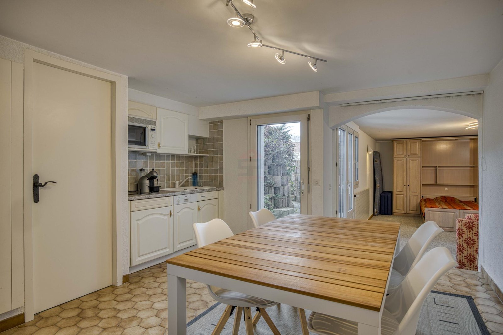 Le rez-de-chaussée accueille une cuisine entièrement équipée avec accès à un balcon orienté est, parfait pour les petits-déjeuners, ainsi qu’un vaste salon-séjour prolongé par une véranda, totalisant près de 60 m². Cet espace de réception s’ouvre directement sur une belle terrasse de 43 m² orientée sud-ouest et sur le jardin, offrant une agréable continuité entre intérieur et extérieur. Un bureau, pouvant également faire office de chambre, ainsi qu’un WC visiteurs complètent ce niveau.