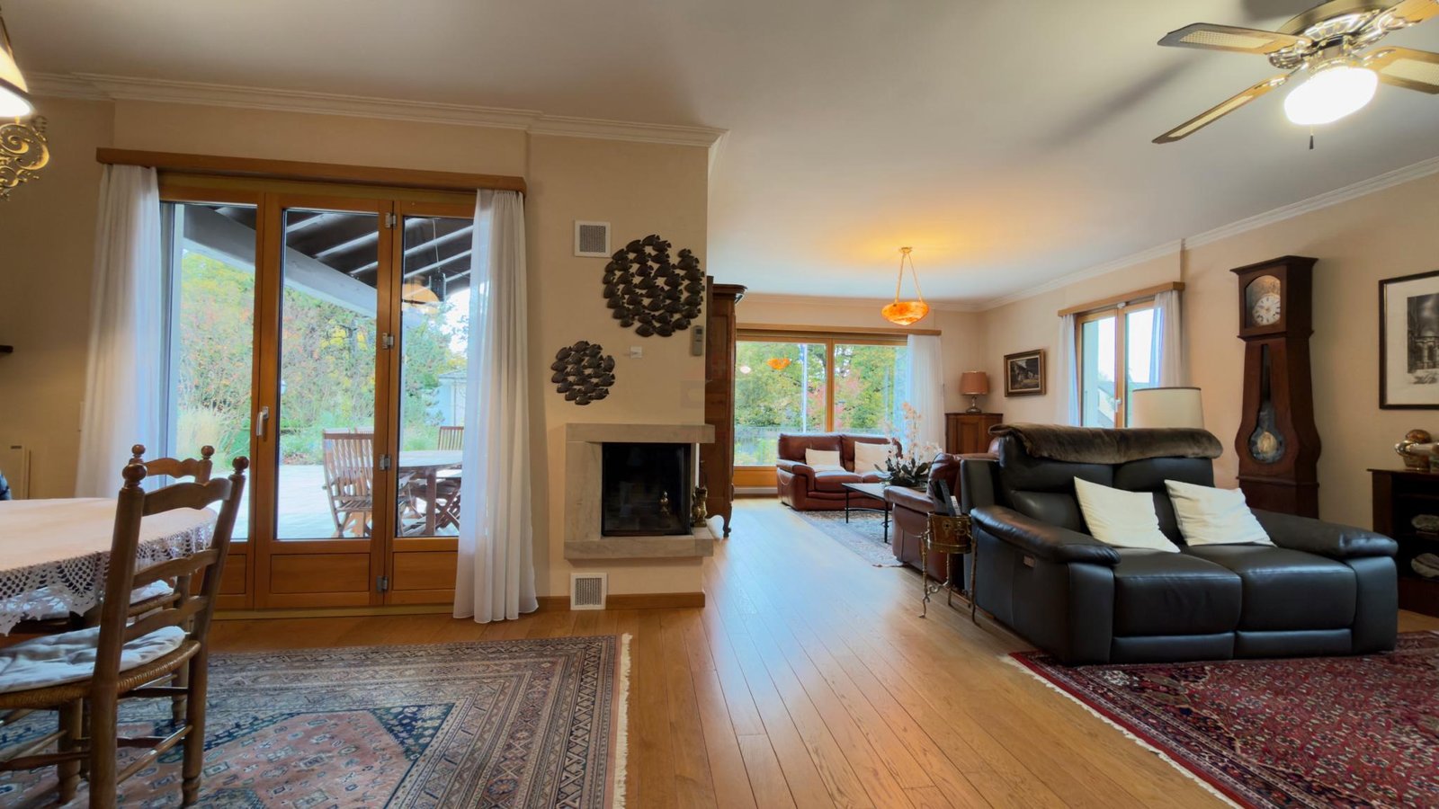 La pièce de vie principale, élégante et conviviale, s’ouvre sur une vaste terrasse plein sud, agrémentée d’un espace repas couvert et d’un barbecue en pierre, idéal pour recevoir en toute intimité.