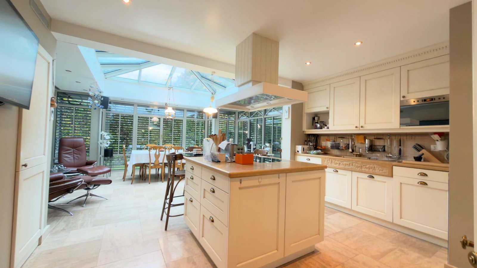 Une véranda baignée de lumière, rénovée en 2017, prolonge la cuisine haut de gamme et crée une transition parfaite entre intérieur et extérieur.