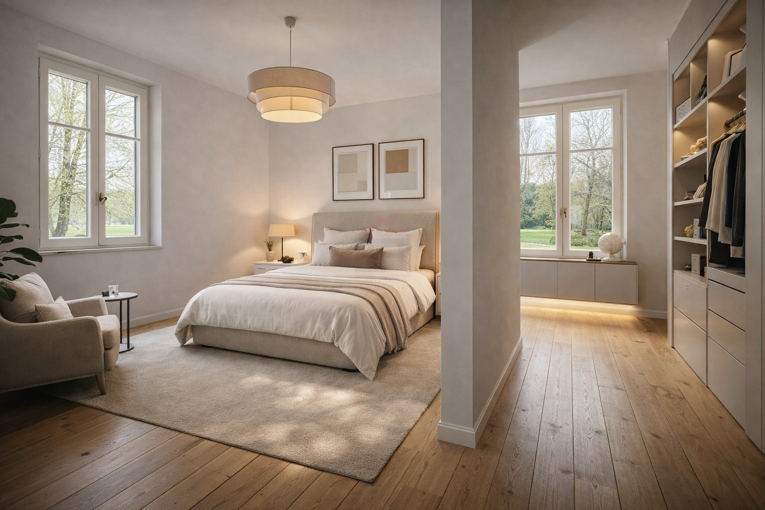 Au dernier niveau, une spacieuse suite s’accompagne d’un espace ouvert modulable, idéal en dressing, bibliothèque ou chambre d’appoint, offrant une flexibilité.