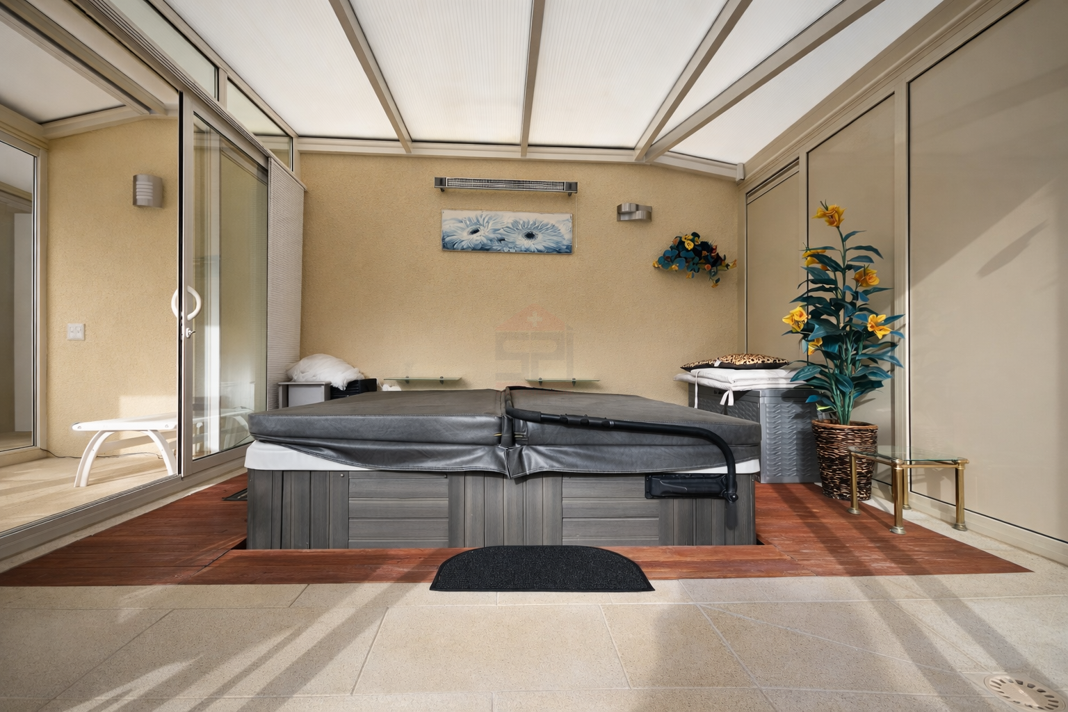 Les extérieurs, parfaitement entretenus, dévoilent un magnifique jardin plat et arboré, exposé Sud-Ouest. Une agréable terrasse couverte permet de profiter pleinement des beaux jours, tandis qu’un espace bien-être entièrement vitré, équipé d’un grand jacuzzi et d’une douche extérieure, invite à la détente en toute saison.